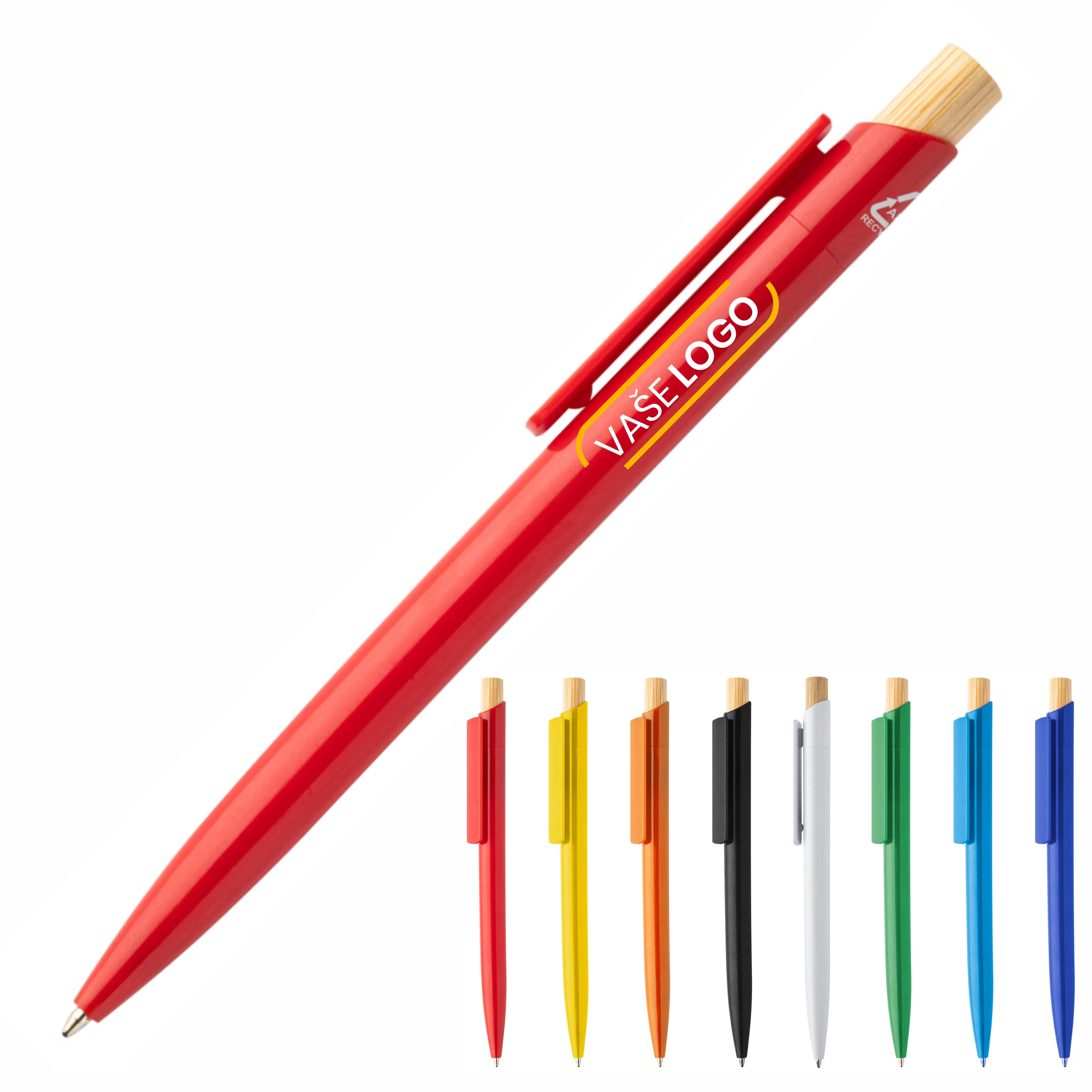 Ekologické guľôčkové pero z recyklovaného ABS plastu s bambusovým tlačidlom s plnofarebnou potlačou loga, textu alebo grafiky v cene. Pero má modrú náplň. Na výber z 8 farieb s plnofarebnou potlačou v cene.