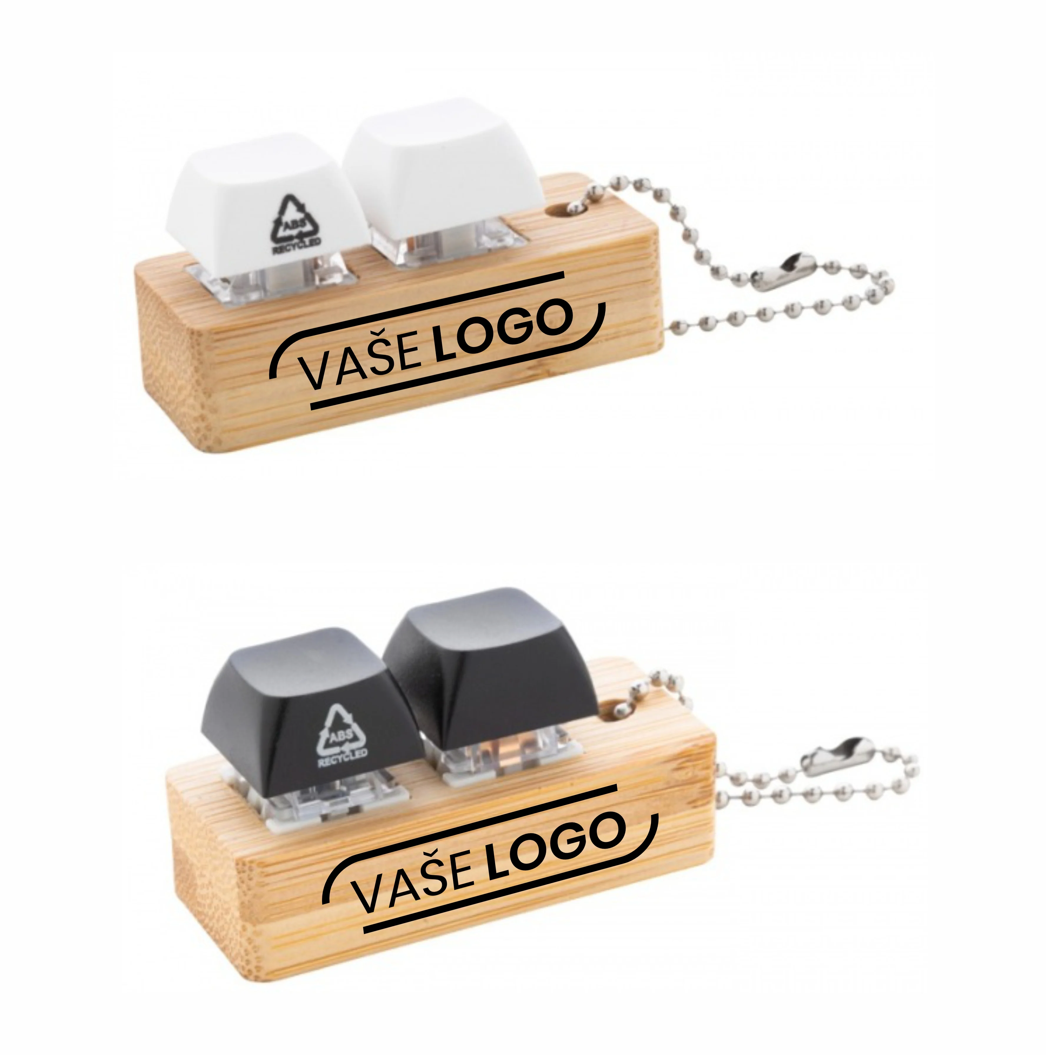 Originálne antistresové kľúčenky s dvoma klávesmi na stláčanie v bambusovom tele - 100KS s plnofarebnou potlačou loga alebo grafiky/textu v cene.