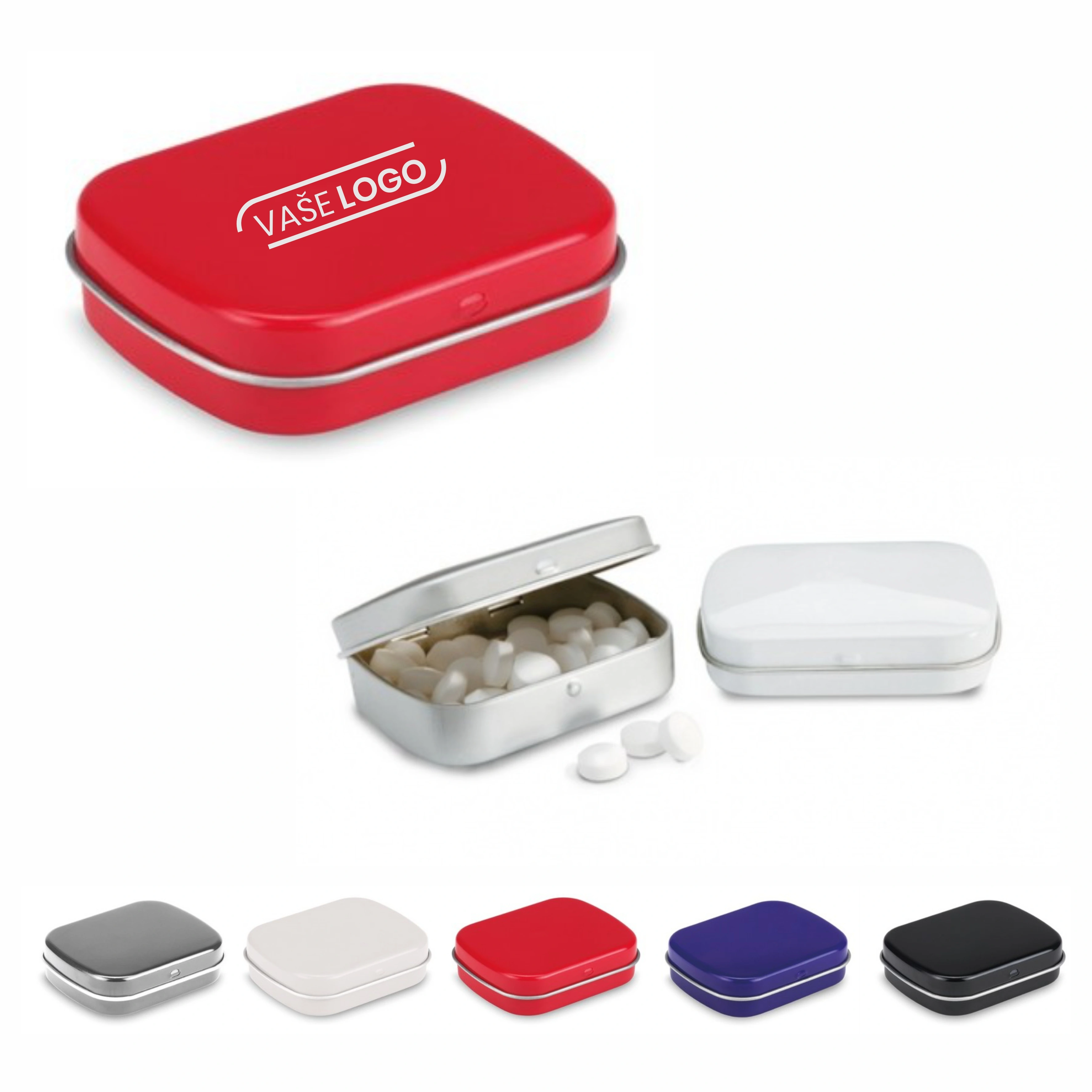 Reklamné mentolové cukríky (cca 28g) v kovovej krabičke - 100KS s gravírovaním loga alebo grafiky. Na výber z 5 farieb s gravírovaním v cene. Rozmer: 60 x 49 x 17mm.