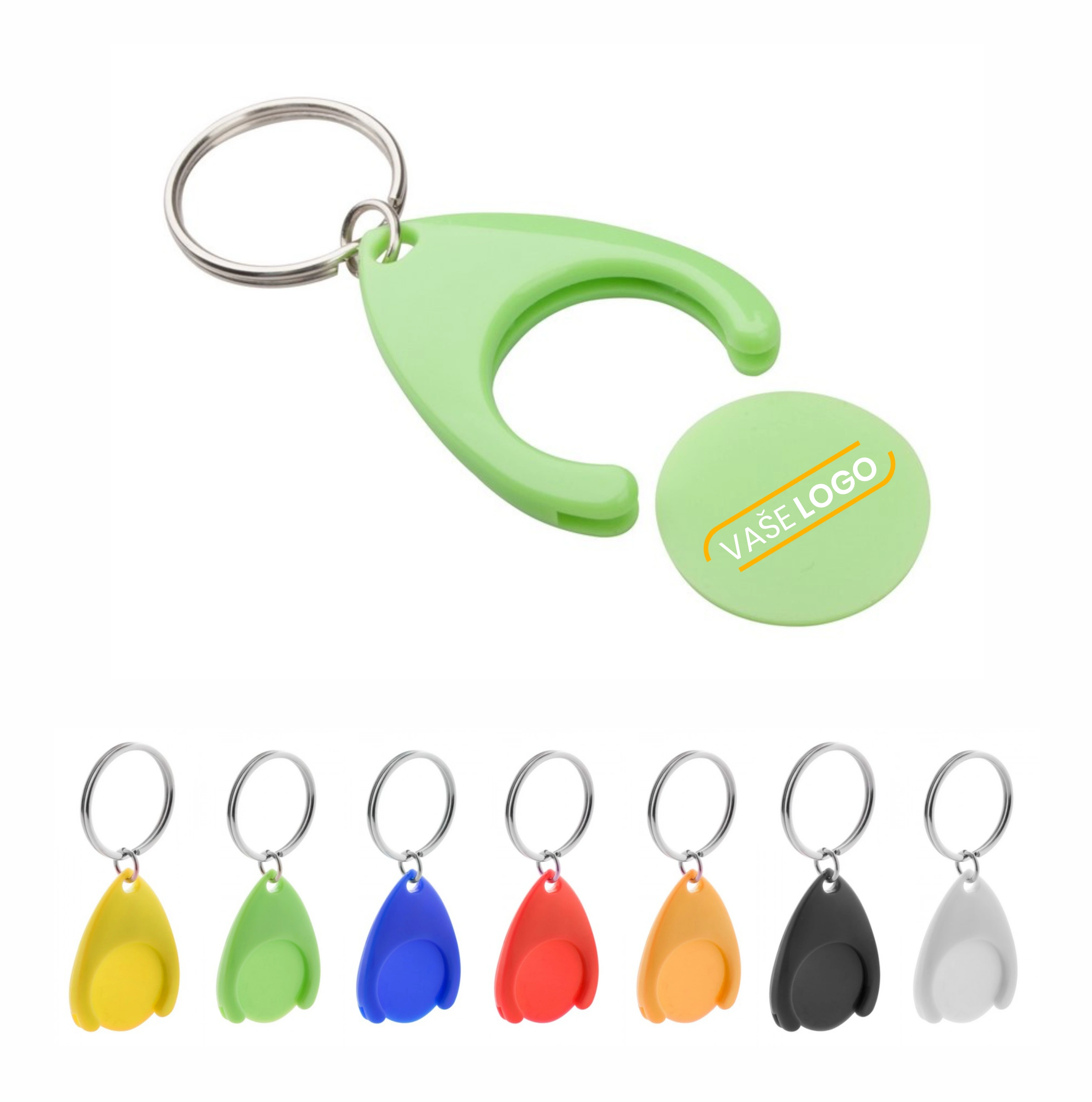 Reklamné plastové kľúčenky so žetónom do nákupných košíkov - 100KS s potlačou loga alebo textu. Na výber zo 7 farieb s plnofarebnou potlačou v cene.