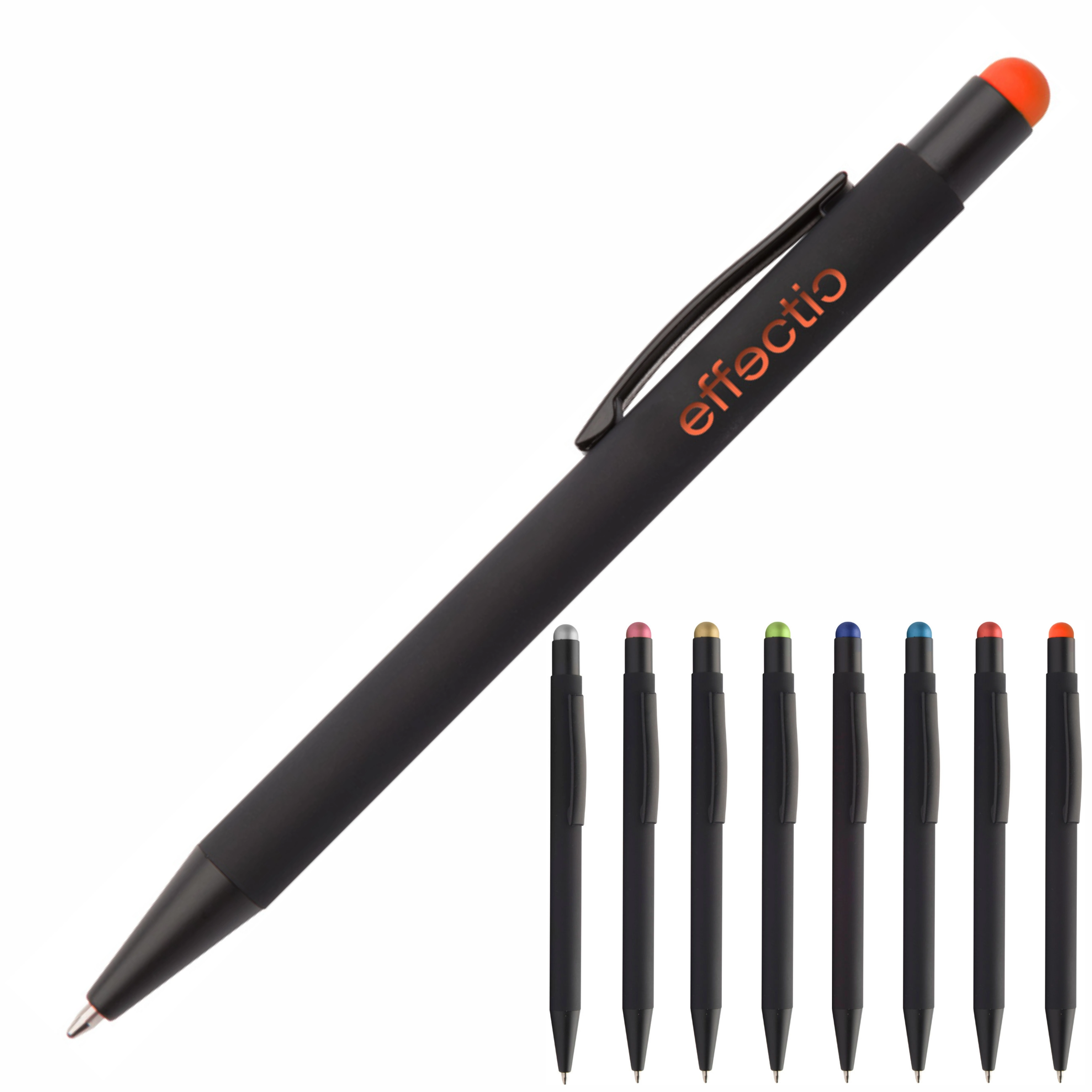 Prémiové dotykové reklamné perá s pogumovaným/softouch povrchom s farebným - zrkadlovým gravírovaním loga, textu alebo grafiky vo farbe pera v cene. Pero má modrú náplň. Na výber z 8 farieb gravírovaním v cene.  celý popis