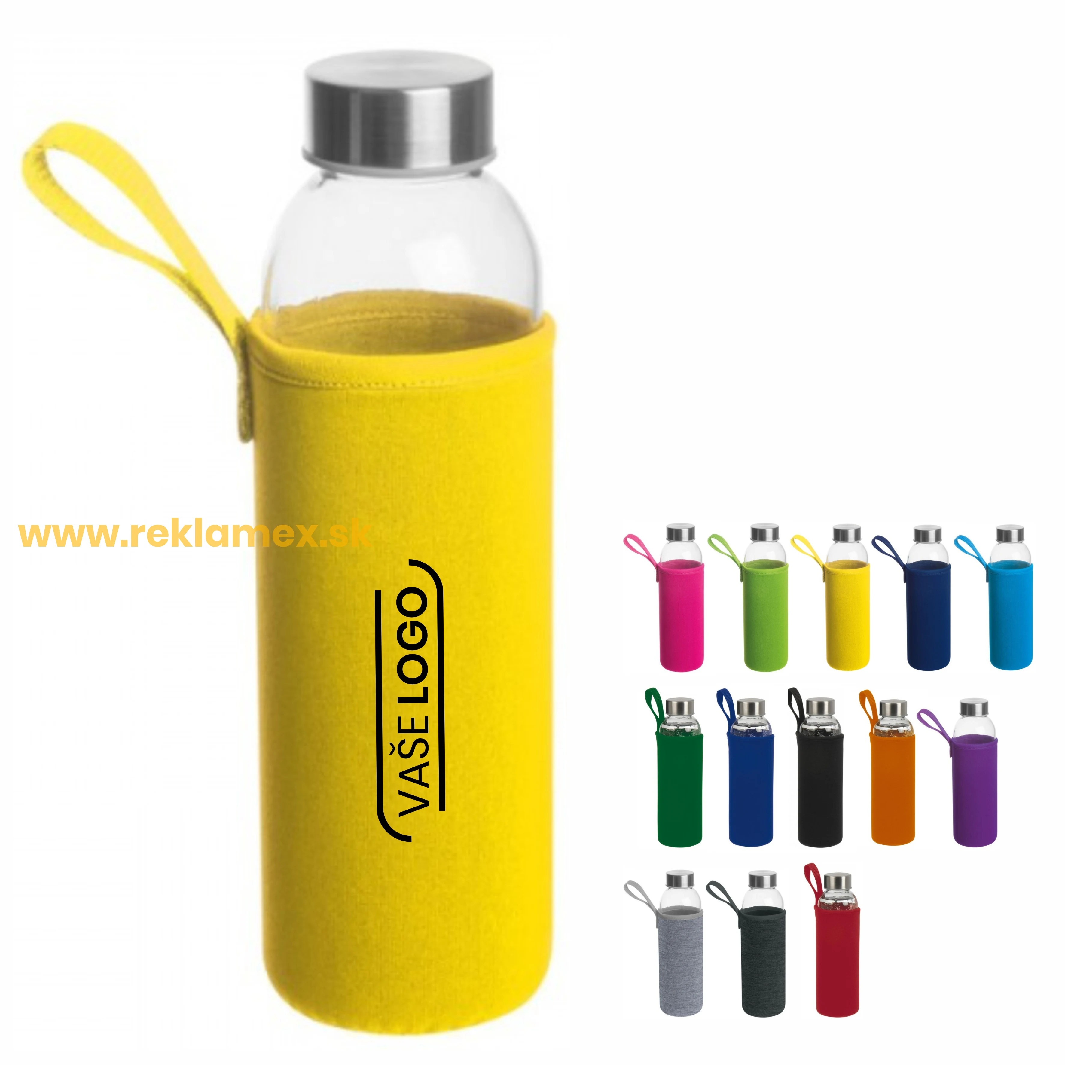 Kvalitné reklamné sklenené fľaše v neoprénovom puzdre s kovovým viečkom a pútkom na zápästie - 20KS s potlačou loga alebo textu. Na výber z 13 farieb s plnofarebnou potlačou v cene. Objem 500ml.