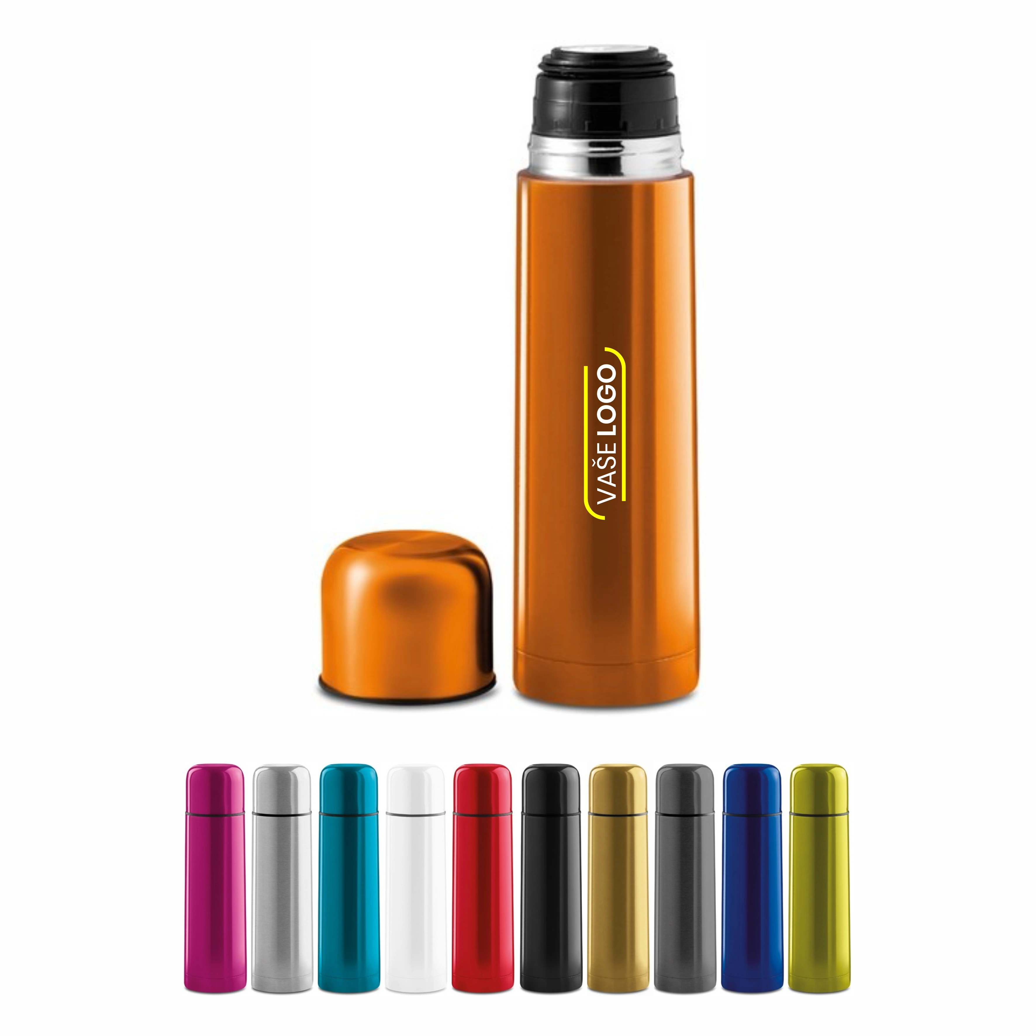 Kvalitné reklamné termosky s dvojitou stenou - 20KS s potlačou loga alebo textu. Na výber z 11 farieb s plnofarebnou potlačou v cene. Objem 500ml.