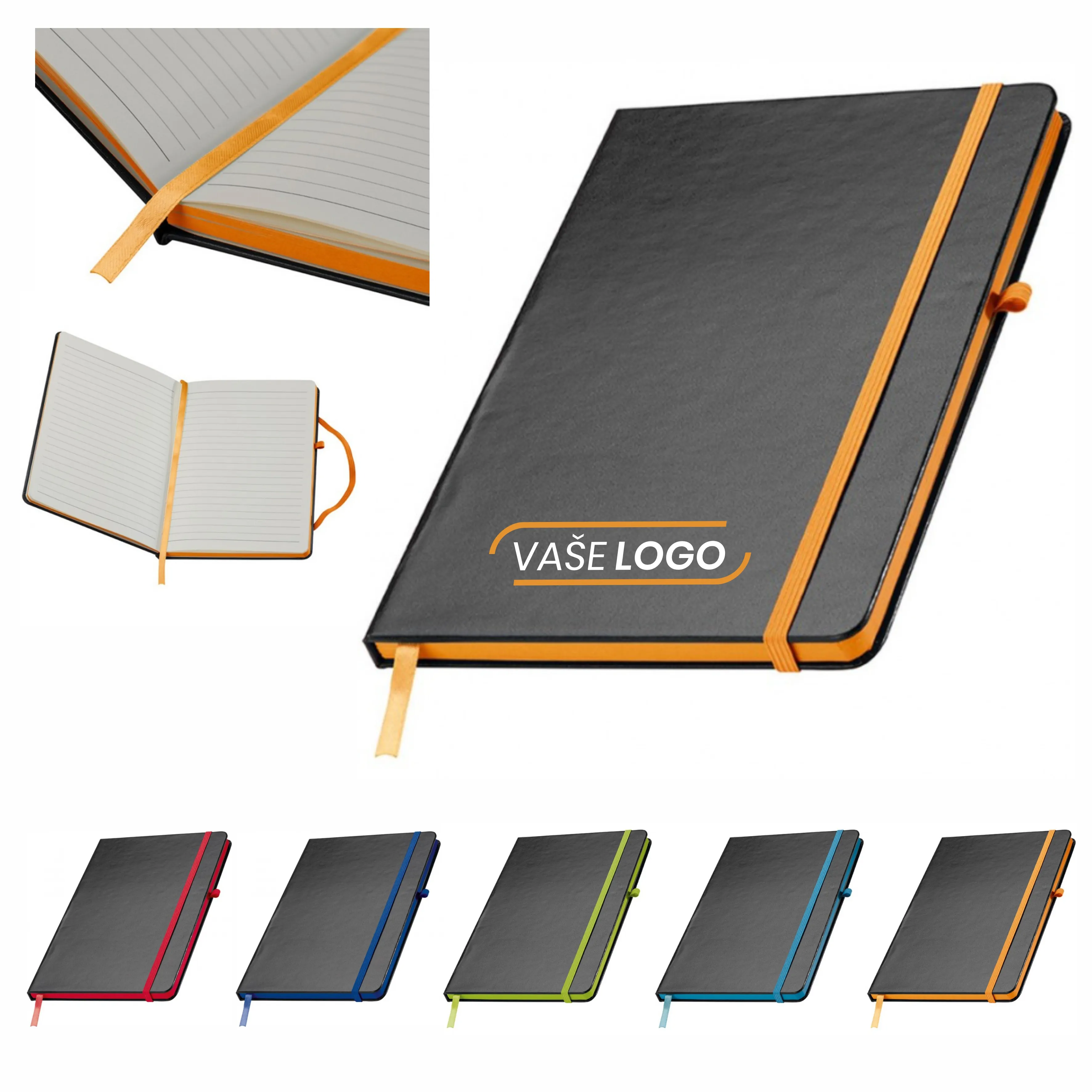 Kvalitné reklamné linajkové zápisníky A5 s gumičkou a pútkom na pero - 20KS s potlačou v cene. Zápisník má tvrdšie dosky a obsahuje 160 linajkových stránok z 60g/m2 papiera s certifikátom FSC. Na výber z 5 farieb s plnofarebnou potlačou loga alebo grafiky v cene.