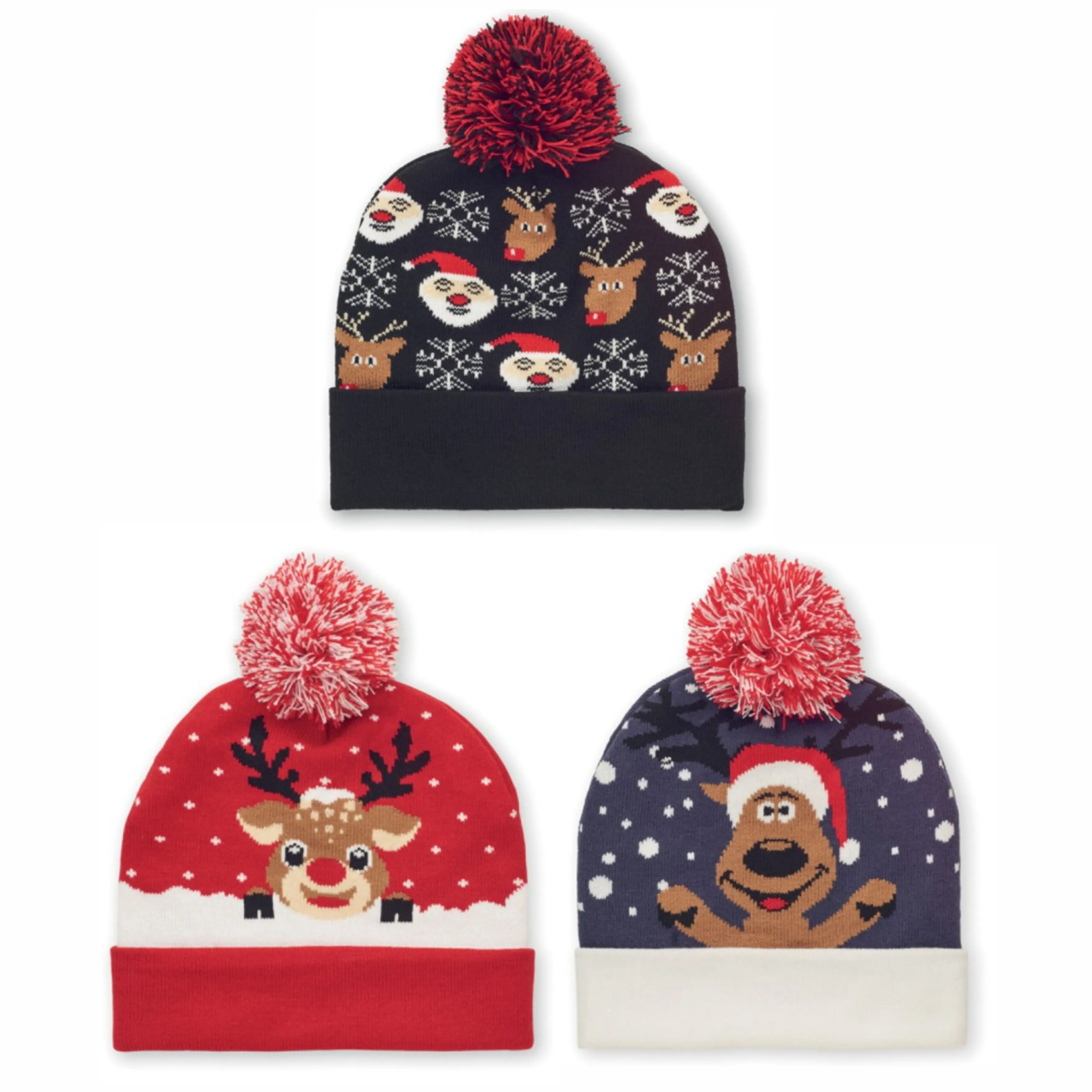 Vianočné pletené čiapky v 3 rôznych motívoch 🎁 - 25KS s dopravou zadarmo. Možnosť výšivky loga alebo vášho textu. Pre cenovú ponuku nás neváhajte kontaktovať. Materiál: Mäkký elastický akrylu. Rozmer: 22 x 21,5 cm.